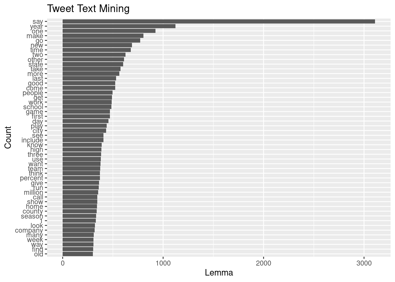labs(x= "Lemma", y="Count", title = "Tweet Text Mining") +
